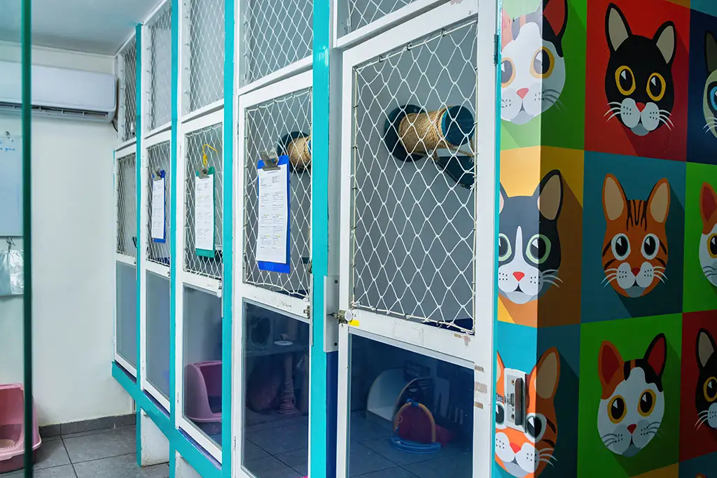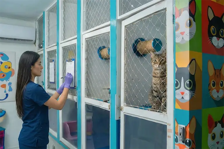 El hospedaje se organiza en espacios individuales, con monitoreo veterinario, cuidado diario y seguimiento durante la estadía.