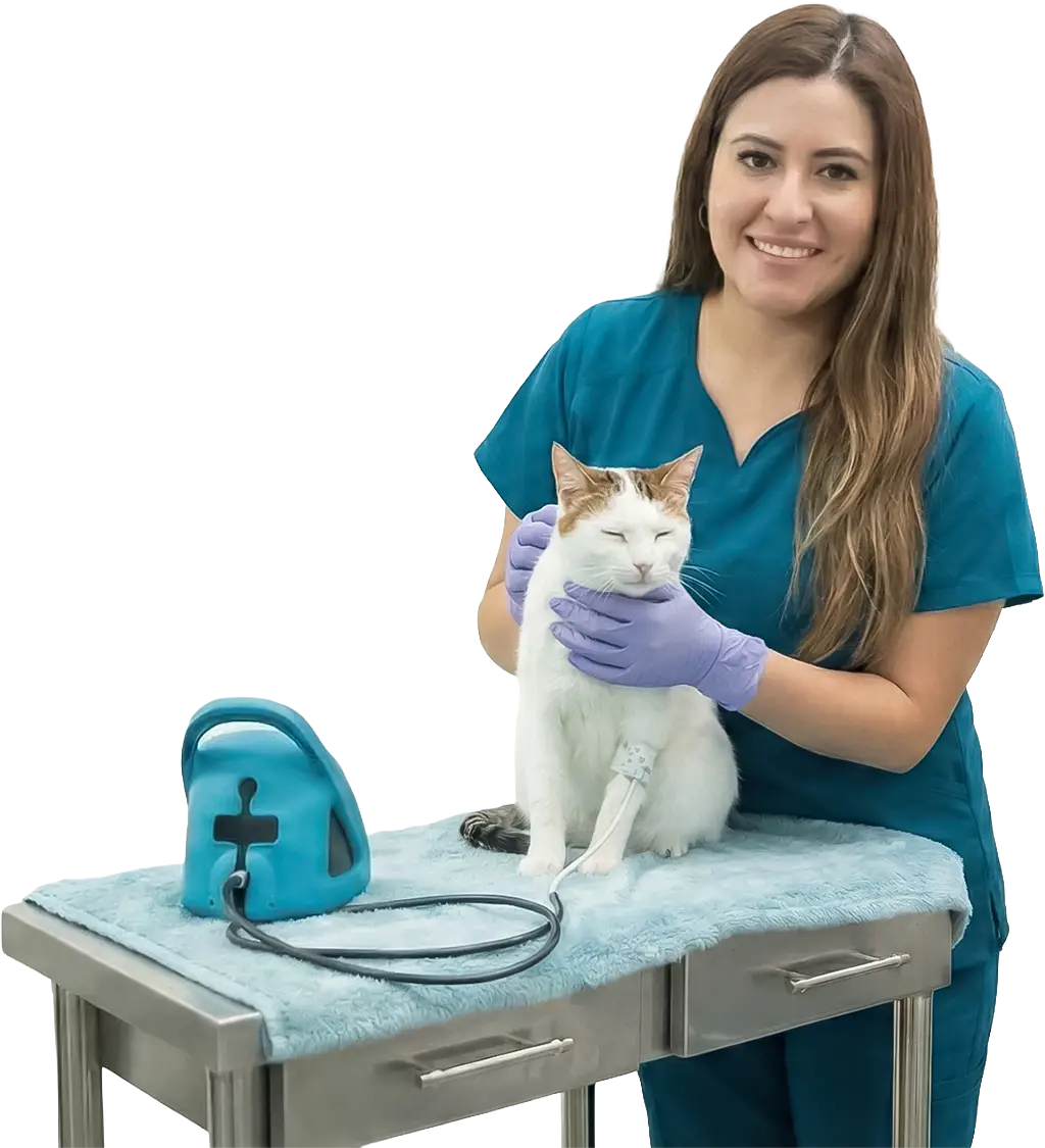 En gatos, medir la presión es fundamental. Por eso la controlamos con tensiómetro veterinario Suntech® en cada consulta y durante el internamiento, como parte del monitoreo clínico.