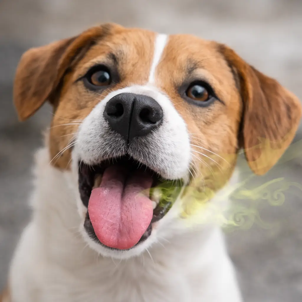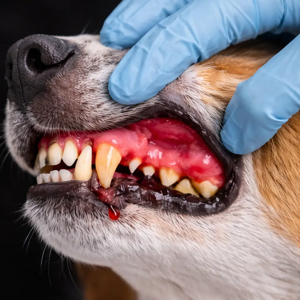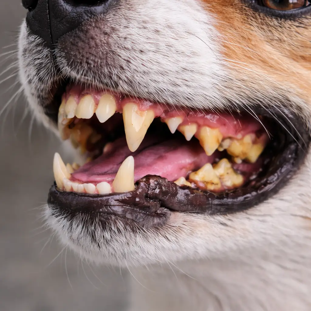 Mal aliento, encías inflamadas, sarro, cambios al comer, babeo, tocarse la boca, cara hinchada.